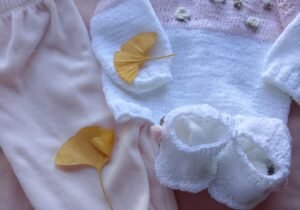 Primeras mudas suéter tejido y pelele +escarpines